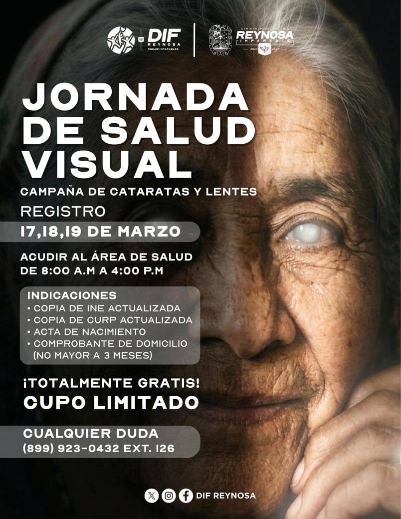 El Alcalde, Carlos Peña Ortiz, a través del Sistema DIF-Reynosa que preside Carlos Luis Peña Garza, invita a la ciudadanía a registrarse en la Jornada de Salud Visual, donde se beneficiará a las familias con campaña de cataratas y entrega de lentes.