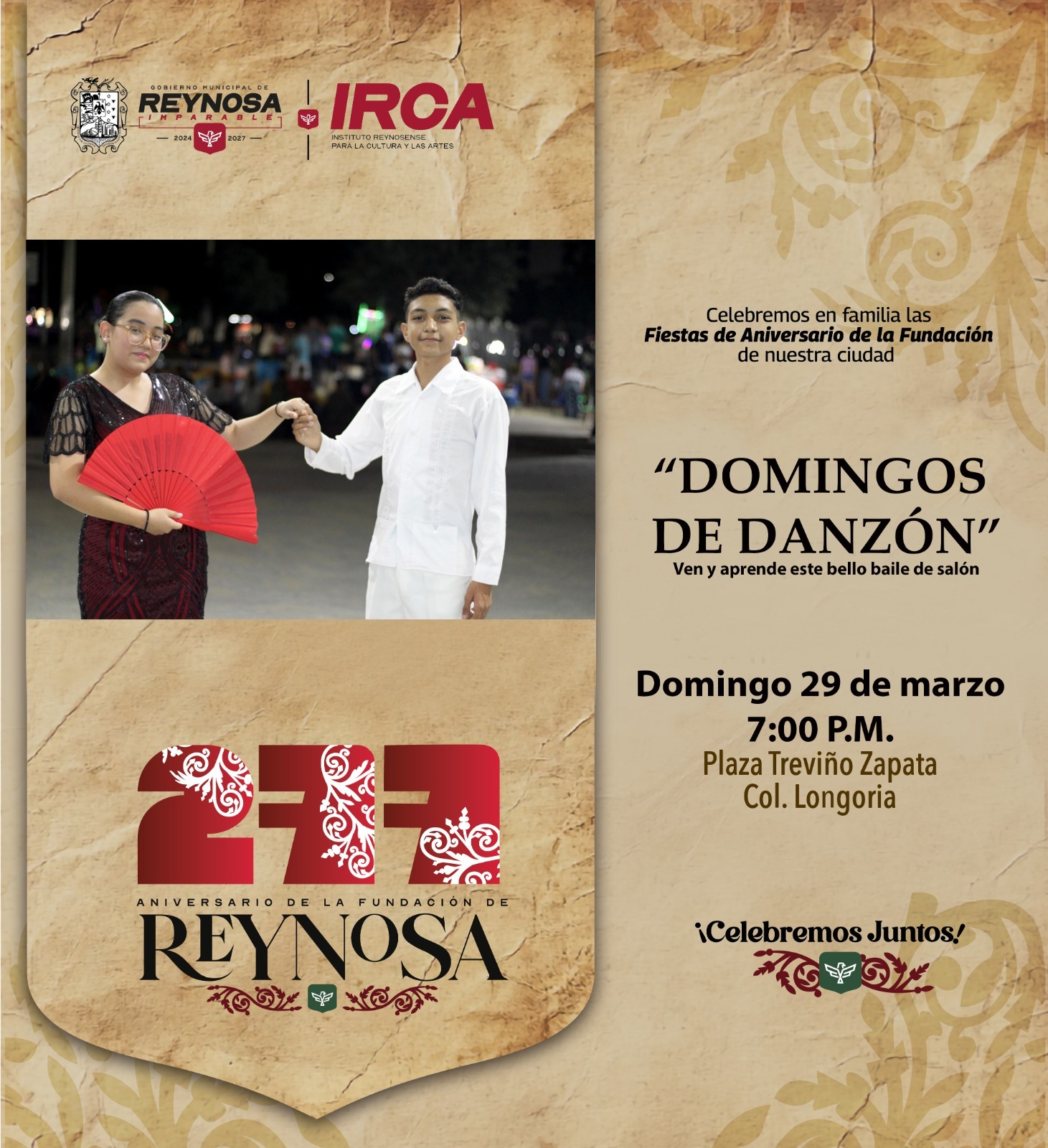 El Gobierno de Reynosa, que preside el Alcalde Carlos Peña Ortiz, invita a festejar 277 años de la fundación de la ciudad este domingo 29 de marzo con eventos gratuitos en dos puntos diferentes a partir de las 7:00 P. M.