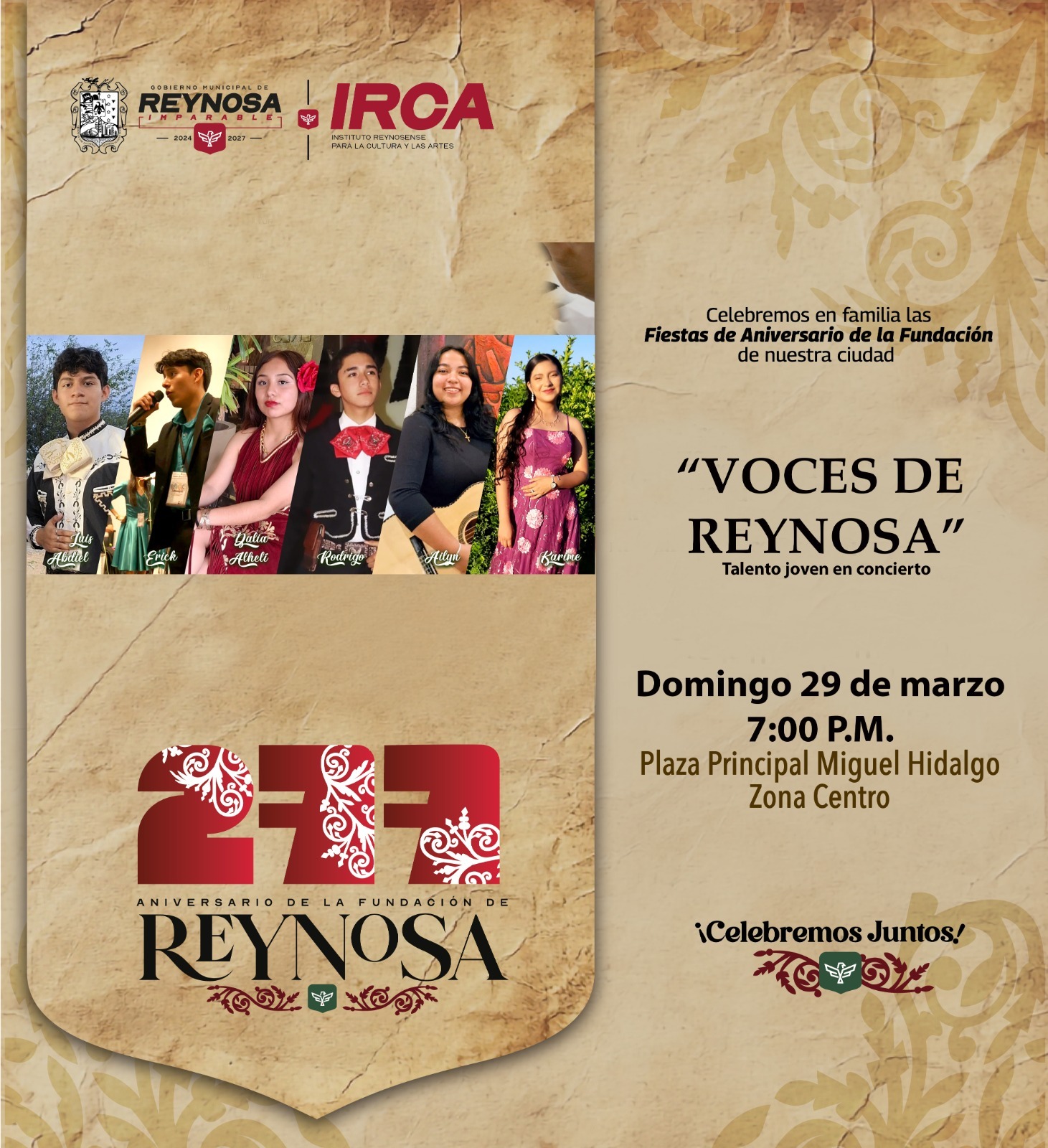El Gobierno de Reynosa, que preside el Alcalde Carlos Peña Ortiz, invita a festejar 277 años de la fundación de la ciudad este domingo 29 de marzo con eventos gratuitos en dos puntos diferentes a partir de las 7:00 P. M.