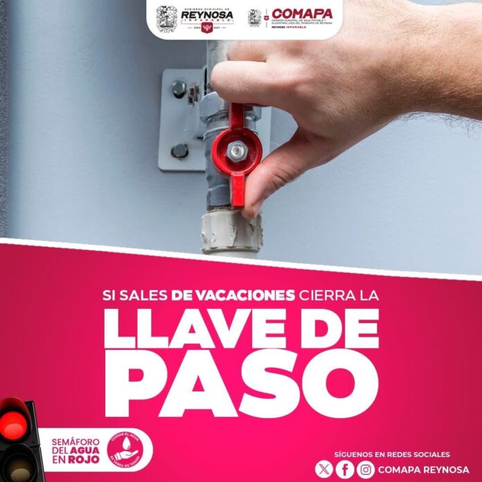 Con el objetivo de fomentar la cultura del cuidado del agua y prevenir incidentes en los hogares, la Comisión Municipal de Agua Potable y Alcantarillado de Reynosa exhorta a los usuarios que saldrán de la ciudad en este periodo vacacional a cerrar la llave de paso de sus domicilios.
