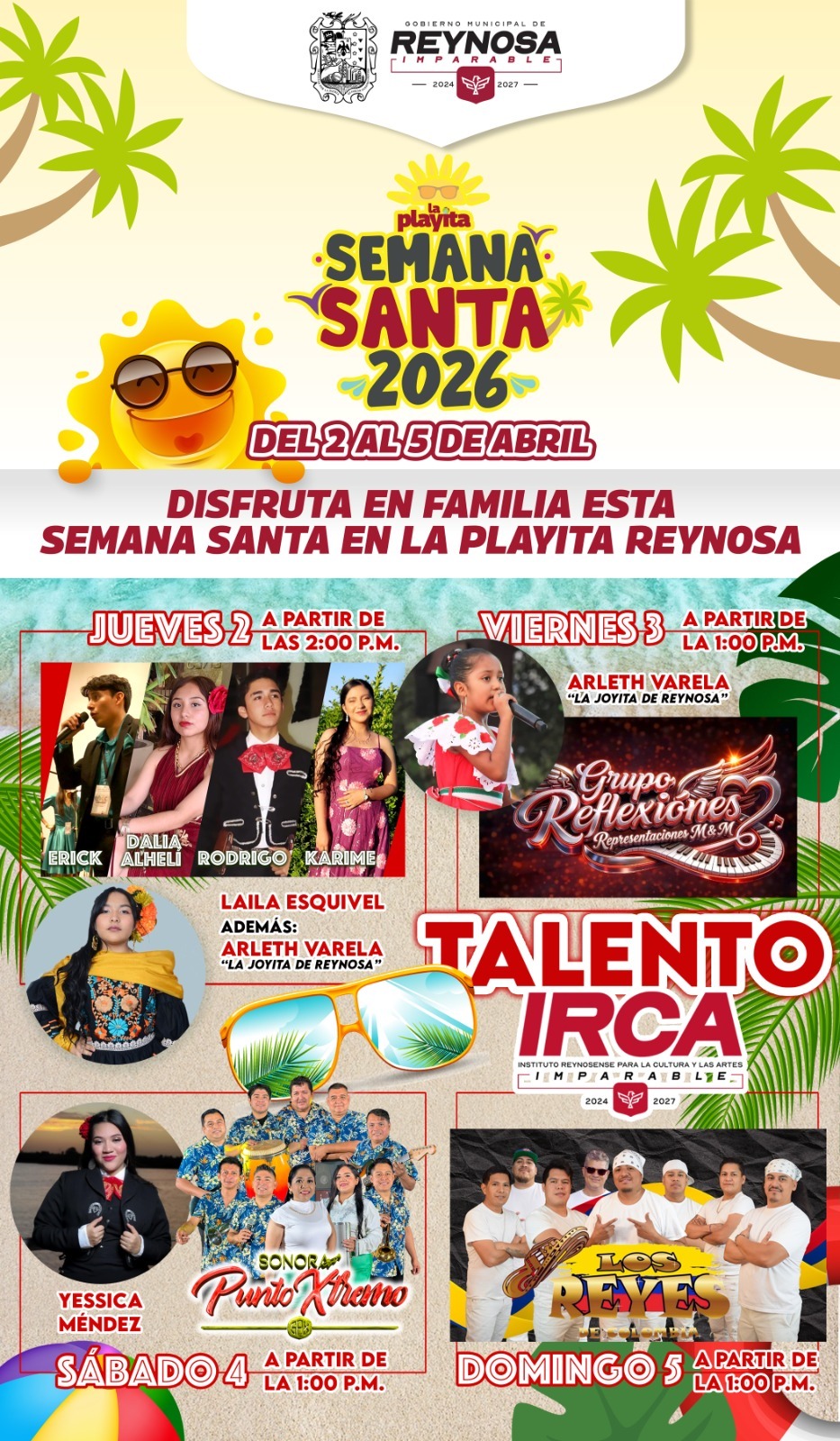 El Gobierno de Reynosa, que preside el Alcalde Carlos Peña Ortiz, invita a disfrutar de la oferta musical que el Instituto Reynosense para la Cultura y las Artes presentará en «La Playita» del 2 al 5 de abril en el marco de la Semana Santa.