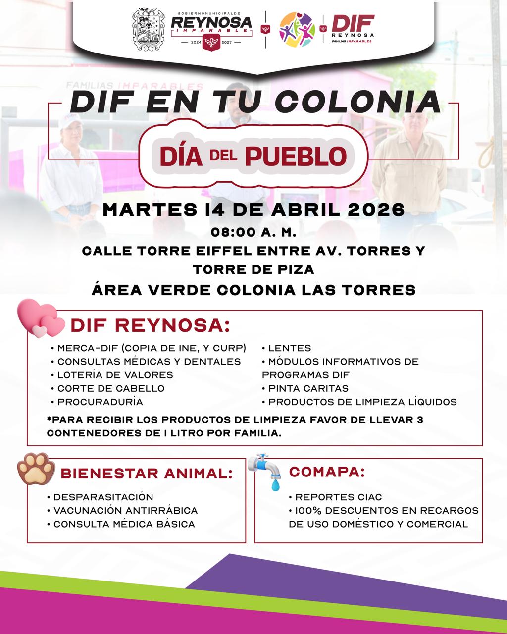 Por instrucciones del Alcalde, Carlos Peña Ortiz, el Sistema DIF-Reynosa que preside Carlos Luis Peña Garza, llevará a la colonia Las Torres la brigada “DIF en tu Colonia”, este próximo martes 14 de abril, acercando diversos servicios gratuitos para beneficio de la comunidad.