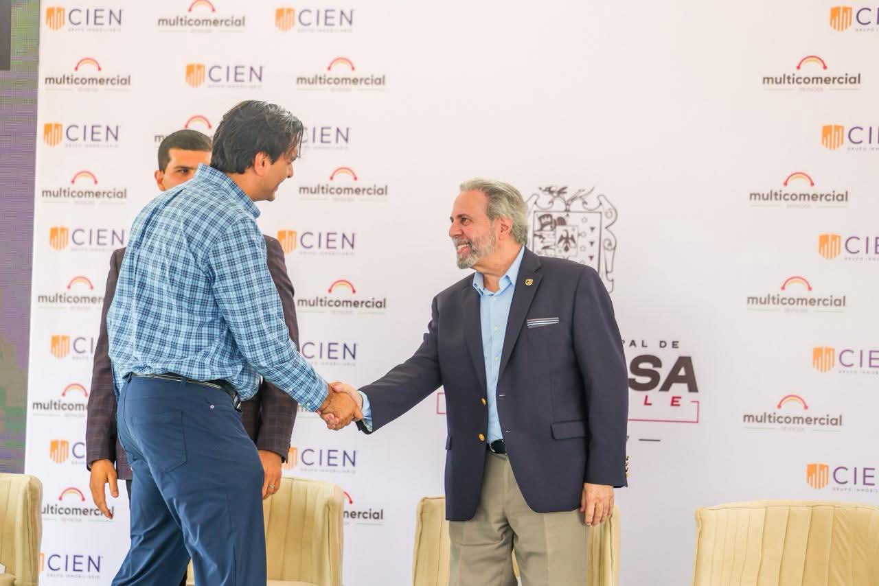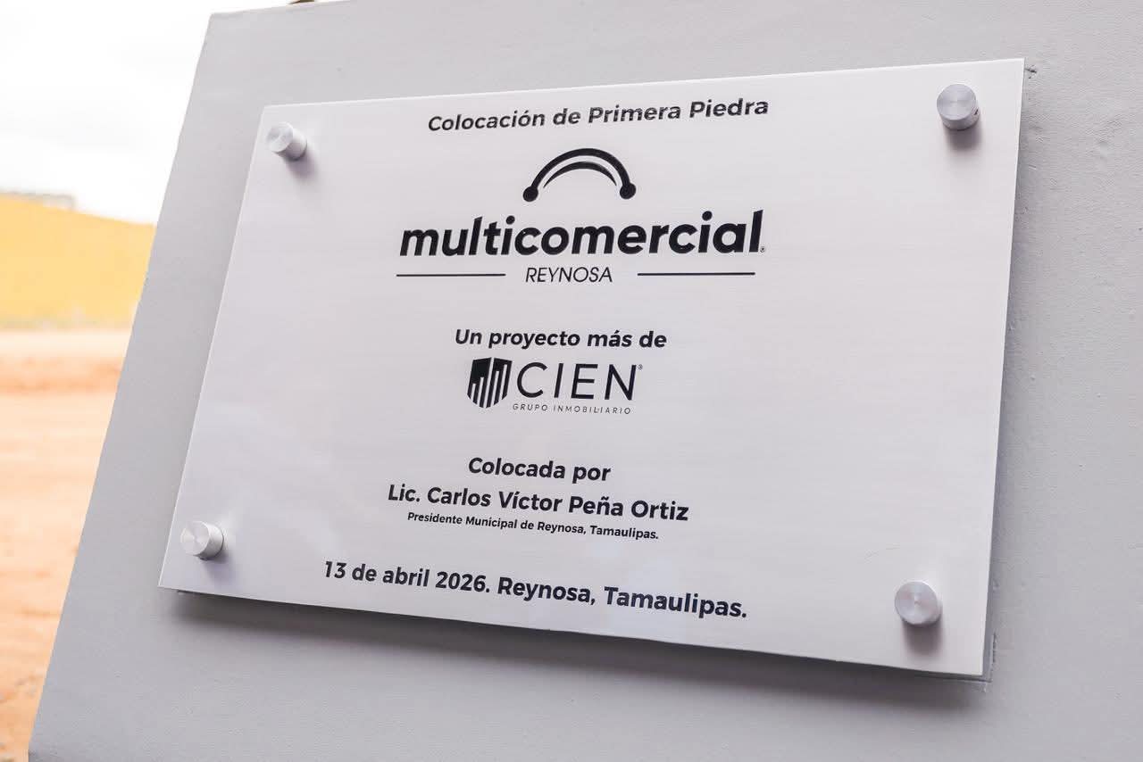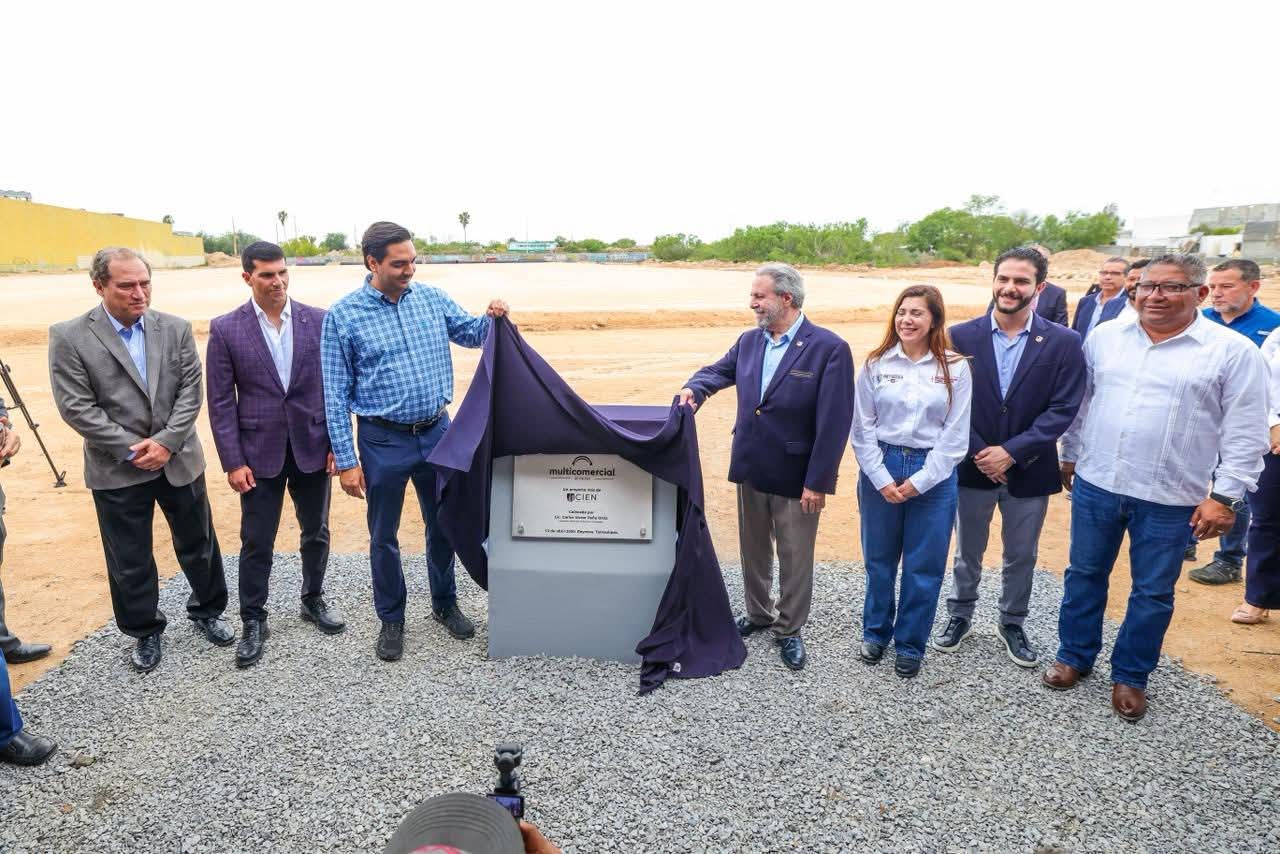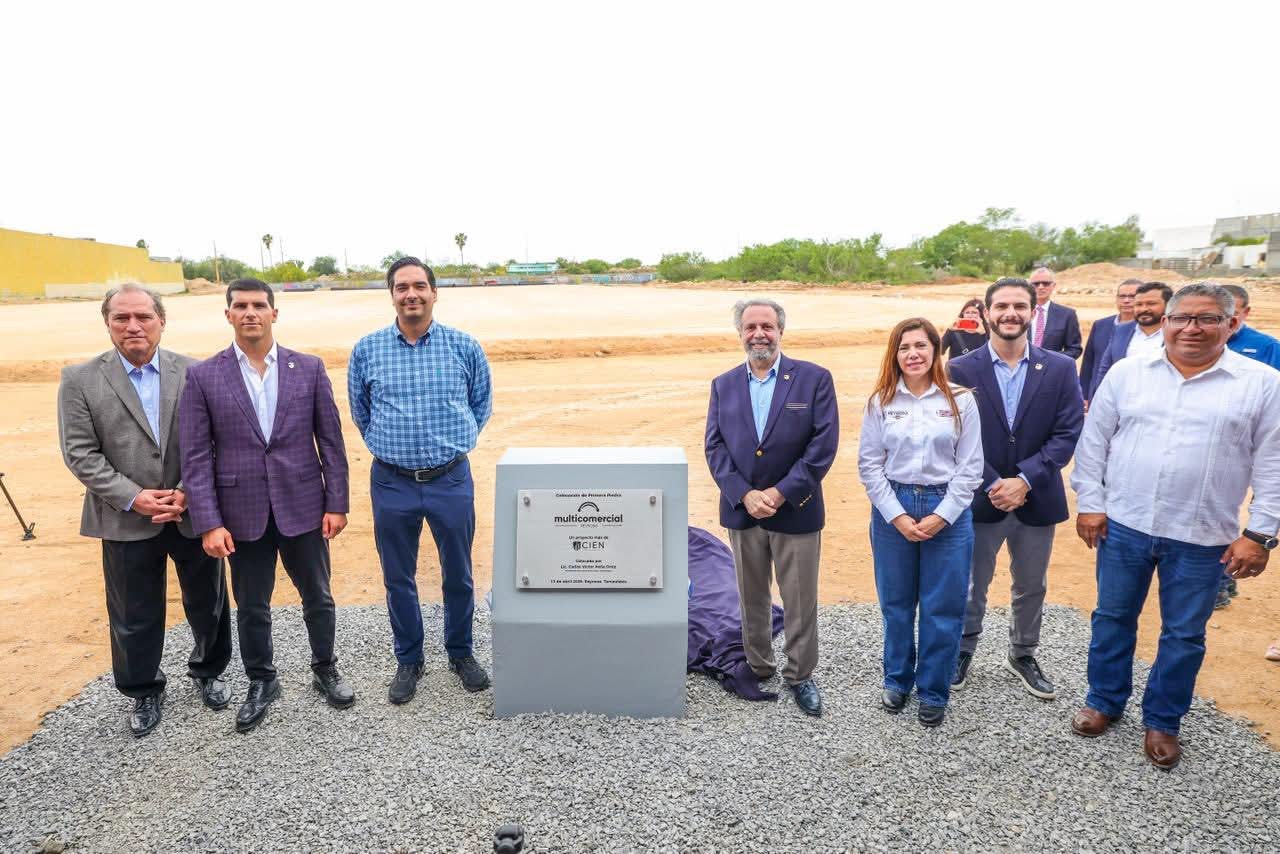 El Presidente Municipal Carlos Peña Ortiz destacó la importancia de la inversión en Multicomercial Reynosa, de Cien Grupo Inmobiliario que encabeza Estiben Handal Dabdoub, con quien develó la primera piedra del nuevo concepto de inversión productiva que se desarrolla en el fraccionamiento Villas de Esmeralda.