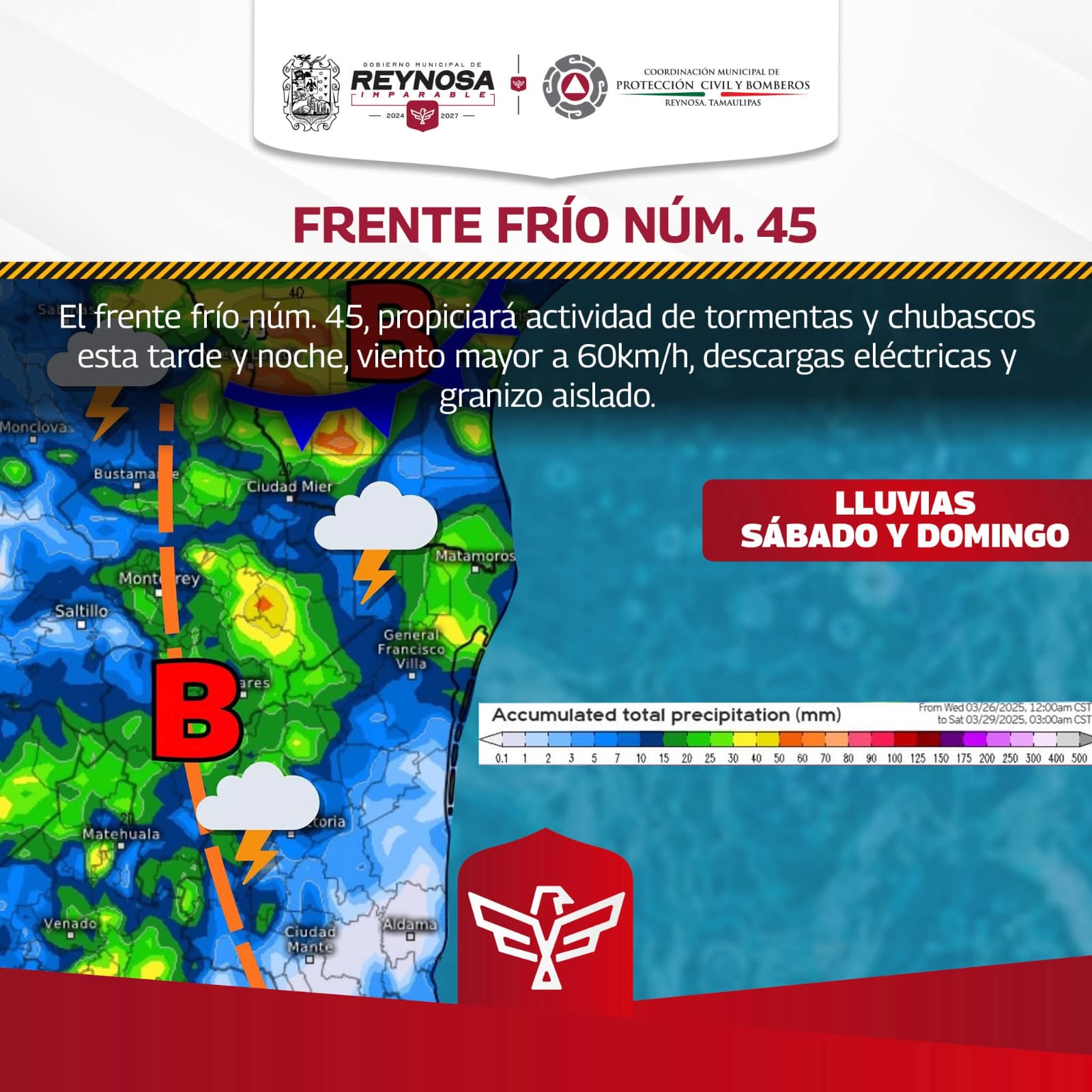 La Coordinación de Protección Civil y Bomberos, PCyB, del Gobierno de Reynosa informa a la comunidad sobre la posibilidad de lluvia por efecto del Frente Frío Número 45 que arribará a la región hoy sábado 18 de abril causando una ligera baja de temperatura.