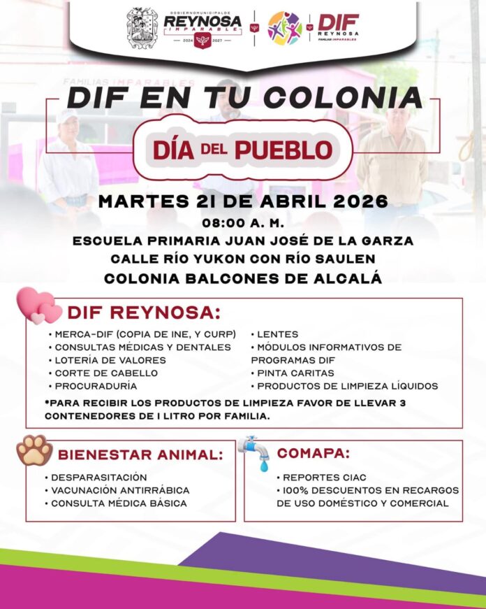 El Sistema DIF-Reynosa que encabeza Carlos Luis Peña Garza, invita a las familias a participar en la brigada “DIF en Tu Colonia», que se realizará el próximo martes 21 de abril a partir de las 08:00 de la mañana, en la Escuela Primaria «Juan José de la Garza», ubicada en la colonia Balcones de Alcalá.