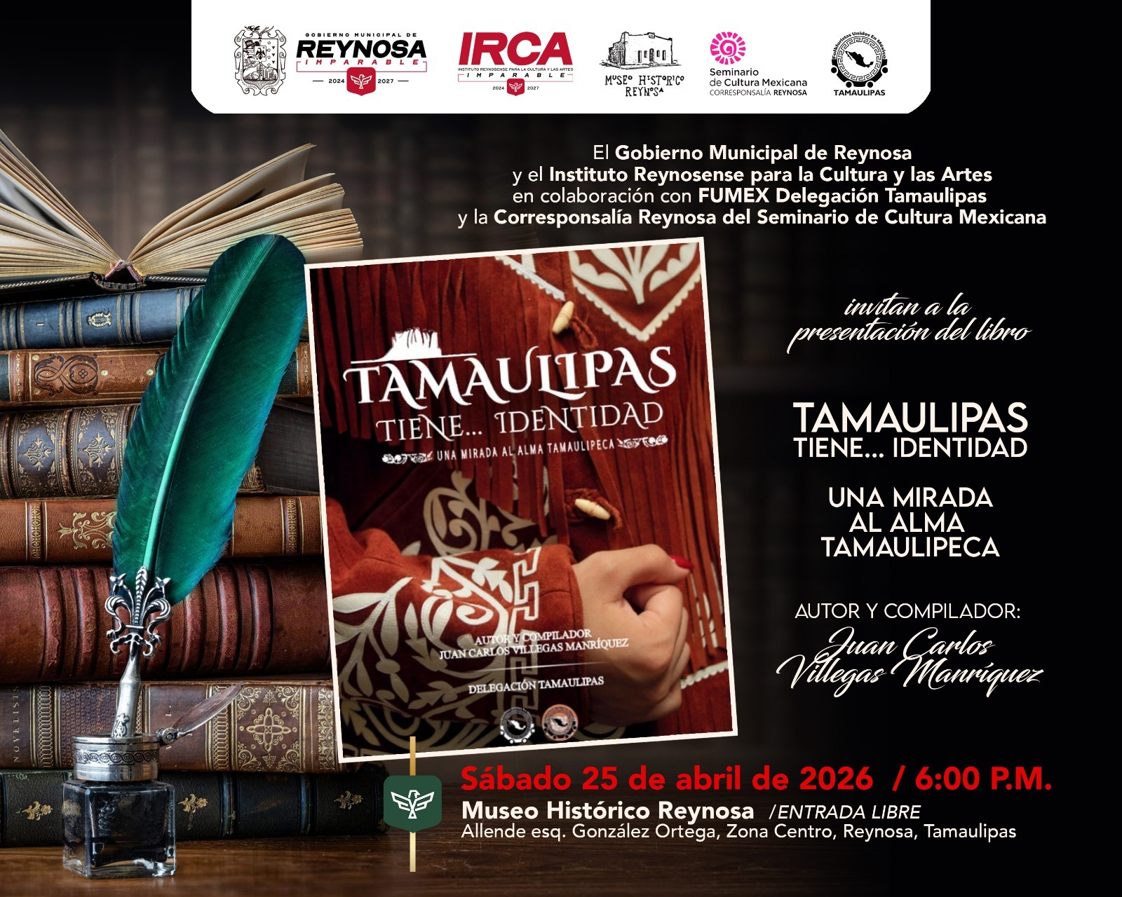El Gobierno de Reynosa, que preside el Alcalde Carlos Peña Ortiz, invita este sábado 25 de abril a la presentación del libro «Tamaulipas tiene… identidad: Una mirada al alma tamaulipeca», autoría del escritor y compilador Juan Carlos Villegas Manríquez.