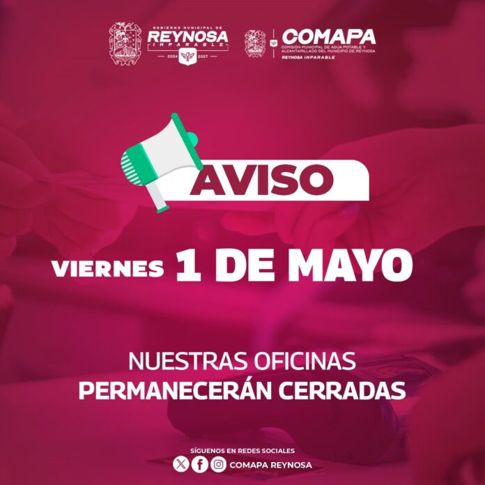 Con motivo del Día del Trabajo y en cumplimiento con la disposición oficial, la Comisión Municipal de Agua Potable y Alcantarillado de Reynosa informa a sus usuarios que este viernes 1 de mayo, las oficinas del organismo permanecerán cerradas.
